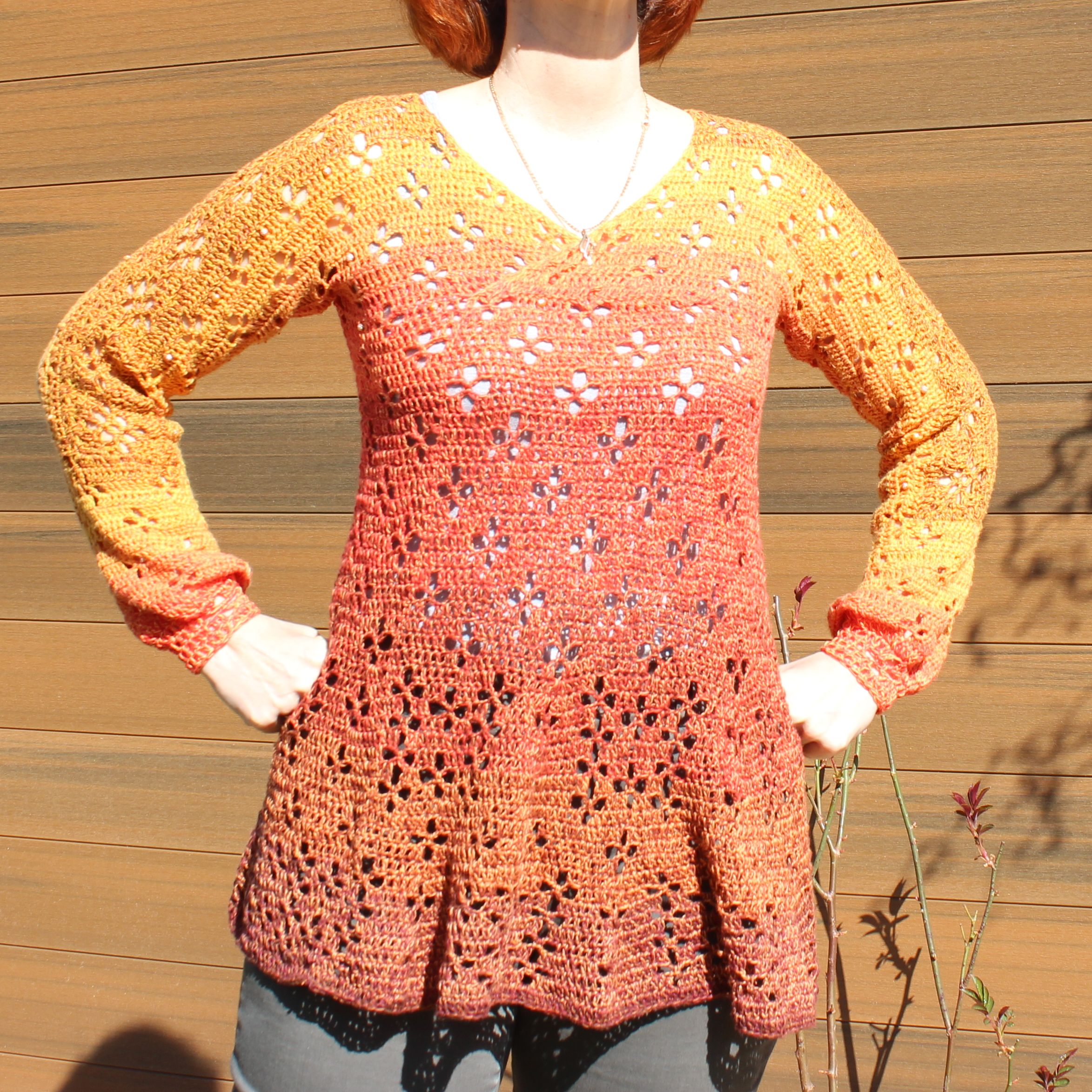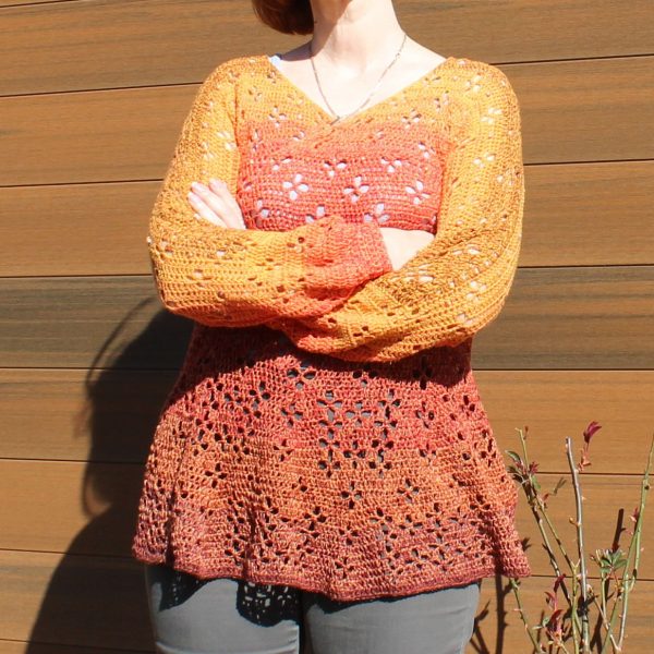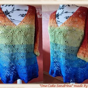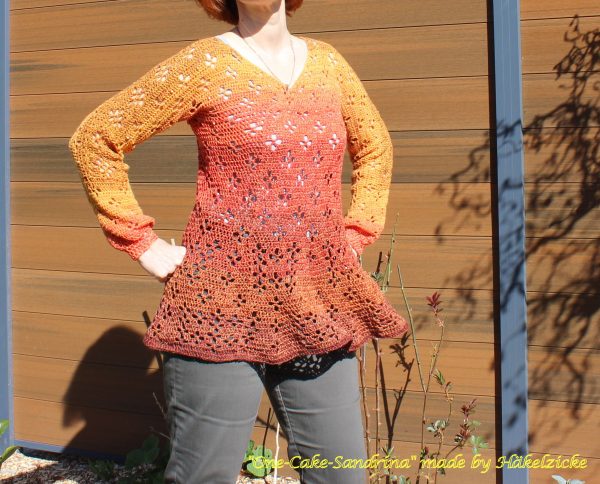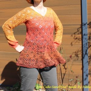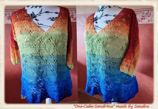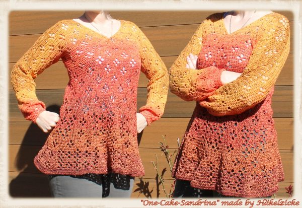 One Cake bedeutet, dass keine Ärmelbobbel benötigt werden, weil die Ärmel in einem mit angehäkelt werden.