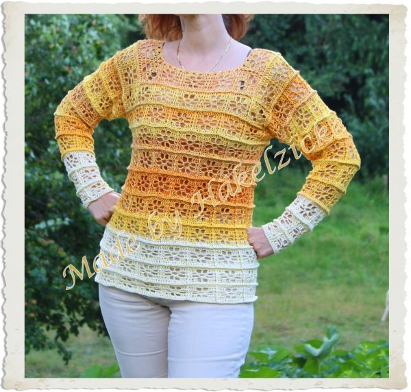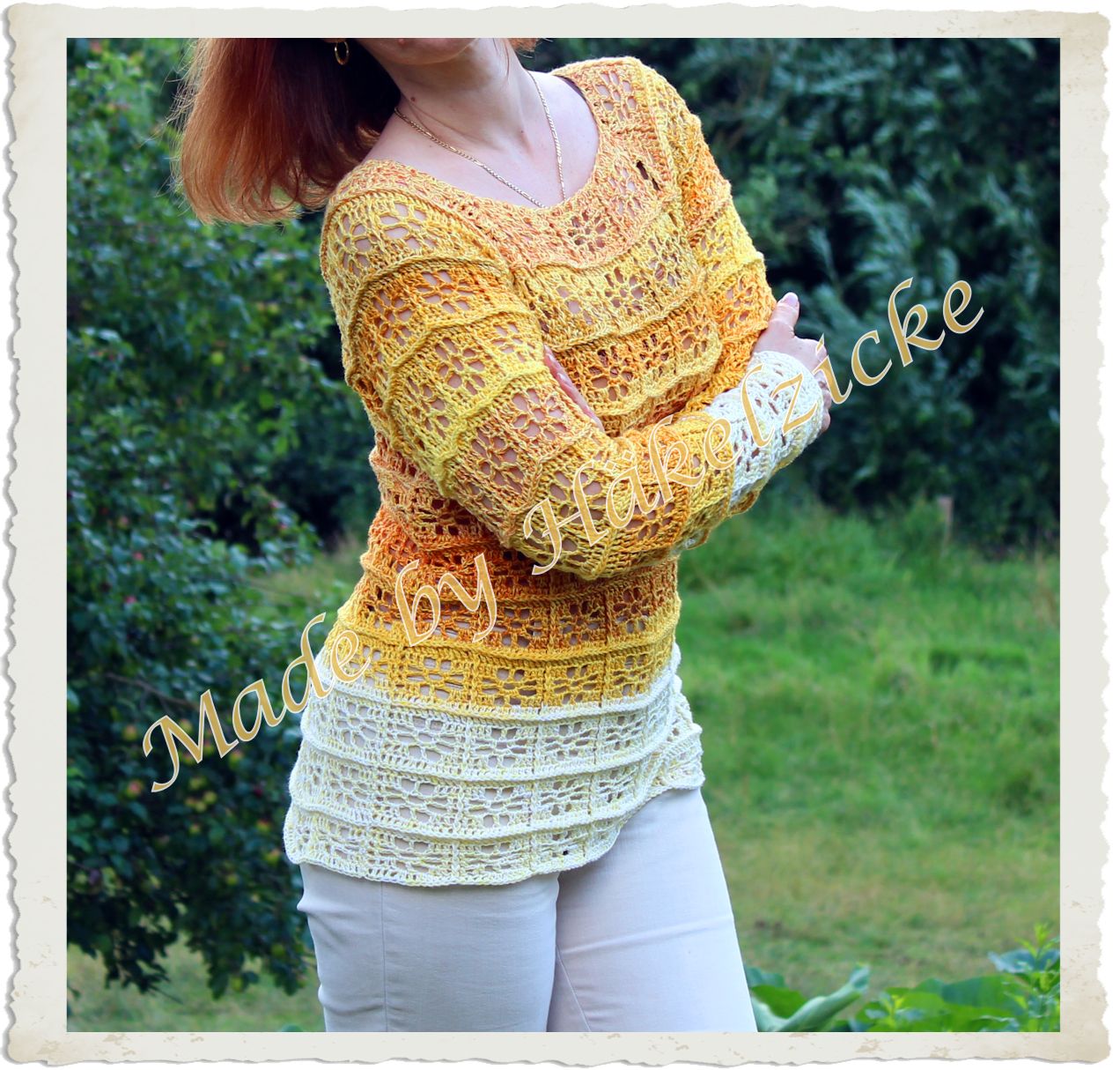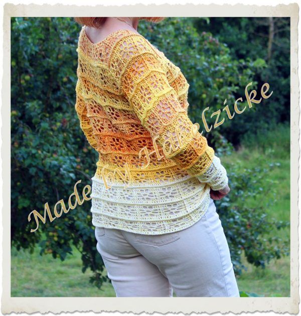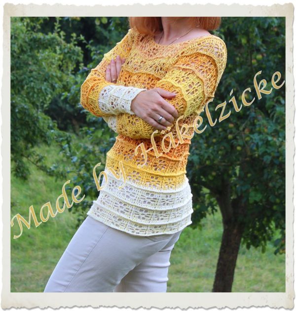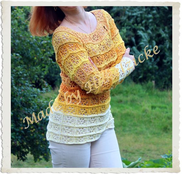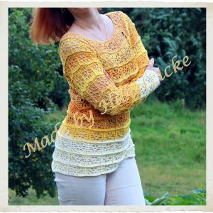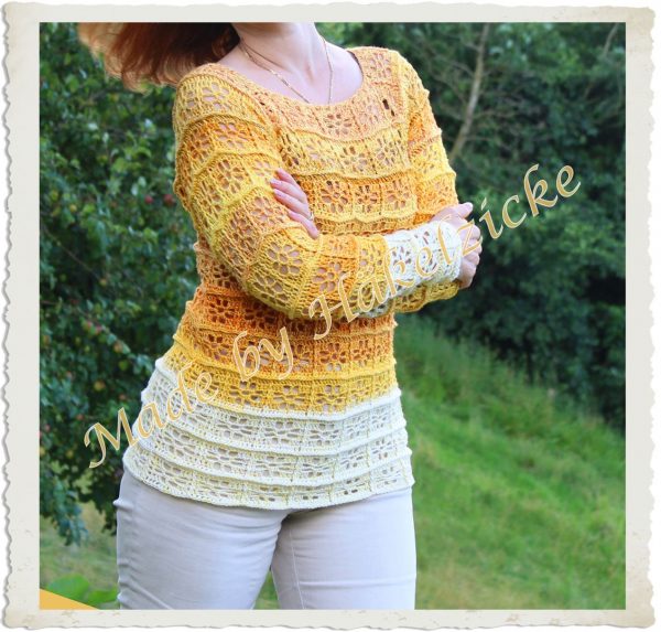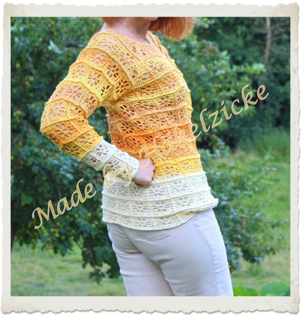 🌻Magic Flowers🌻 ist ein Toller Pulli für alle Jahreszeiten, je nach gewählter Wolle. Du kannst Ihn mit beliebiger Wolle häkeln, da in RVO gearbeitet wird. Die hübschen Blüten entstehen ganz nebenbei beim Häkeln und machen Dein neues Lieblingsstück zu einem Hingucker.