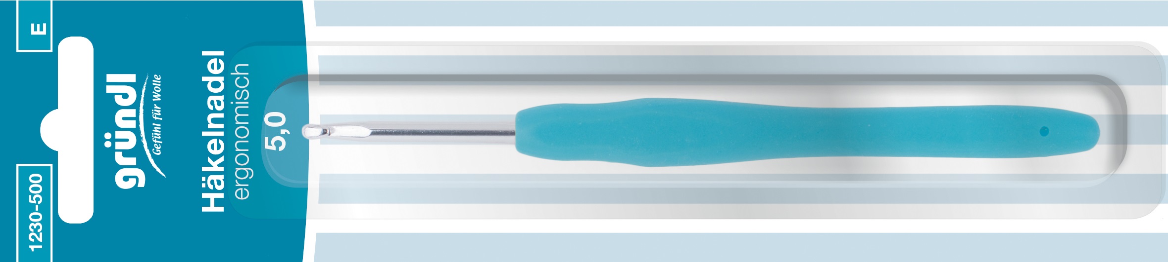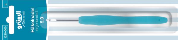 Diese Häkelnadel von Gründl hat einen gummierten Griff und ist ergonomisch geformt. Dadurch liegt sie gut in der Hand. Der Kopf ist aus Aluminium.
