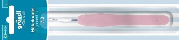 Diese Häkelnadel von Gründl hat einen gummierten Griff und ist ergonomisch geformt. Dadurch liegt sie gut in der Hand. Der Kopf ist aus Aluminium.