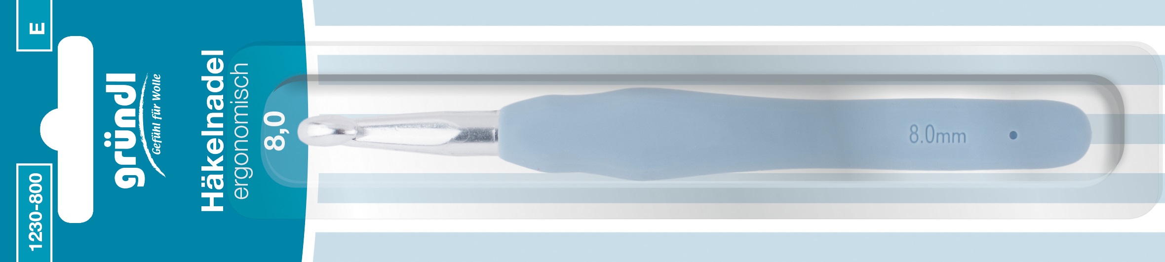 Diese Häkelnadel von Gründl hat einen gummierten Griff und ist ergonomisch geformt. Dadurch liegt sie gut in der Hand. Der Kopf ist aus Aluminium.