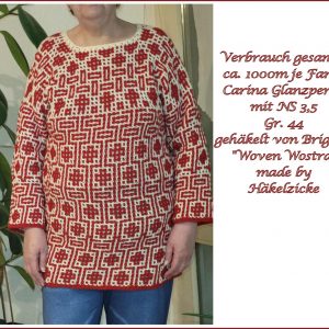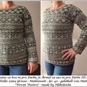 In der Facebookgruppe Maschenmagier und Fadenfeen https://www.facebook.com/groups/maschenmagierundfadenfeen wird es zu jedem Teil die Möglichkeit geben Fragen zu stellen, Hilfe zu bekommen, Deine Fortschritte zu zeigen und Dich an den Fortschritten der anderen zu freuen und inspirieren zu lassen. „Woven Wostra“ ist ein Unisex-Pullover und daher für Männer und Frauen getestet.