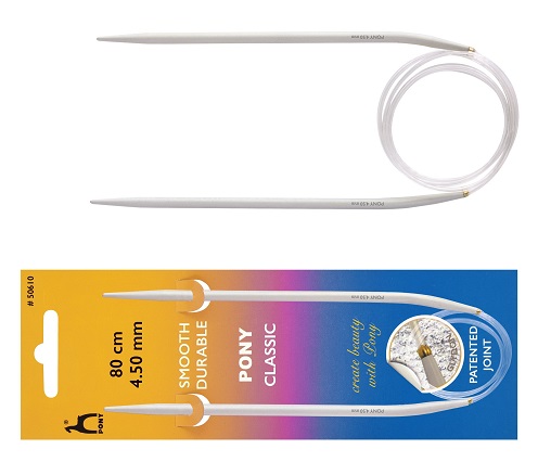 Die traditionelle Stricknadel von PONY in klassisch silbergrau. Die Nadeln sind Kunststoff, die Seile sind transparent. Das Seil ist nahtlos an der Nadel befestigt, so dass man hervorragend mit den Rundstricknadeln stricken kann. Die Nadeln sind insgesamt 80 cm lang. (Das Bild ist ein Beispielbild)