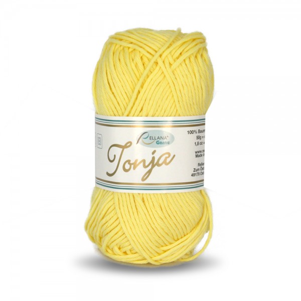 Tonja ist ein Schul- oder Topflappengarn, es ist dicker als andere Baumwolle, daher am besten geeignet für Topflappen. Es ist ein stabiles Garn aus 100 % Baumwolle. Man kann auch schöne andere Accessoires aus der Tonja arbeiten, z. B. Eierwärmer.
