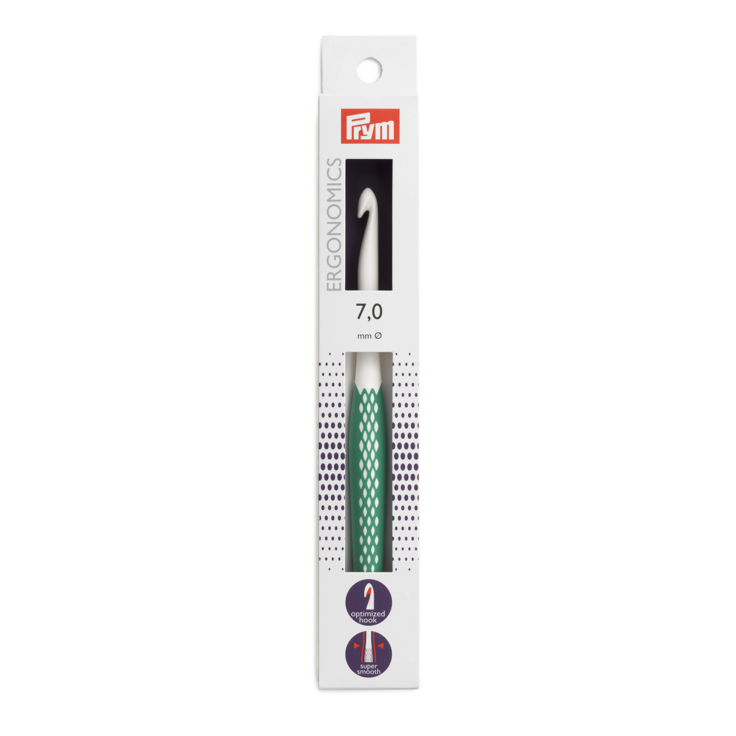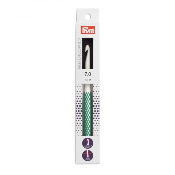 Die Ergonomics Häkelnadel von Prym ist ergonomisch geformt und liegt dadurch sehr gut in der Hand. Sie hat einen langen Griff, so dass man völlig entspannt häkeln kann. Die Nadel besteht auch Kunststoff, welches sehr hochwertig ist. Der Haken der Nadle ist hochglanzpoliert, so dass der Haken leicht durch die Maschen gleitet. Der Griff ist matt und soft.