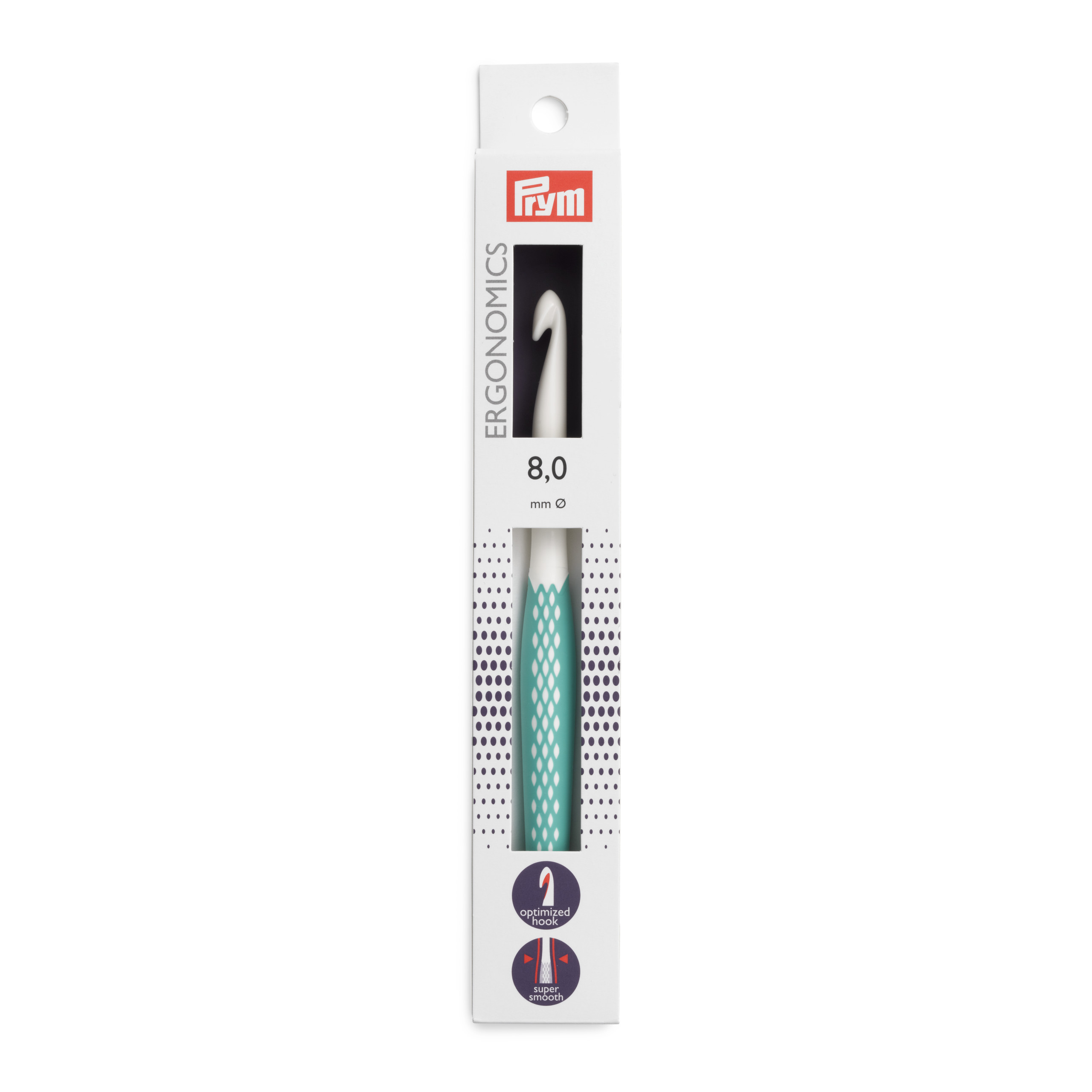 Die Ergonomics Häkelnadel von Prym ist ergonomisch geformt und liegt dadurch sehr gut in der Hand. Sie hat einen langen Griff, so dass man völlig entspannt häkeln kann. Die Nadel besteht auch Kunststoff, welches sehr hochwertig ist. Der Haken der Nadle ist hochglanzpoliert, so dass der Haken leicht durch die Maschen gleitet. Der Griff ist matt und soft.